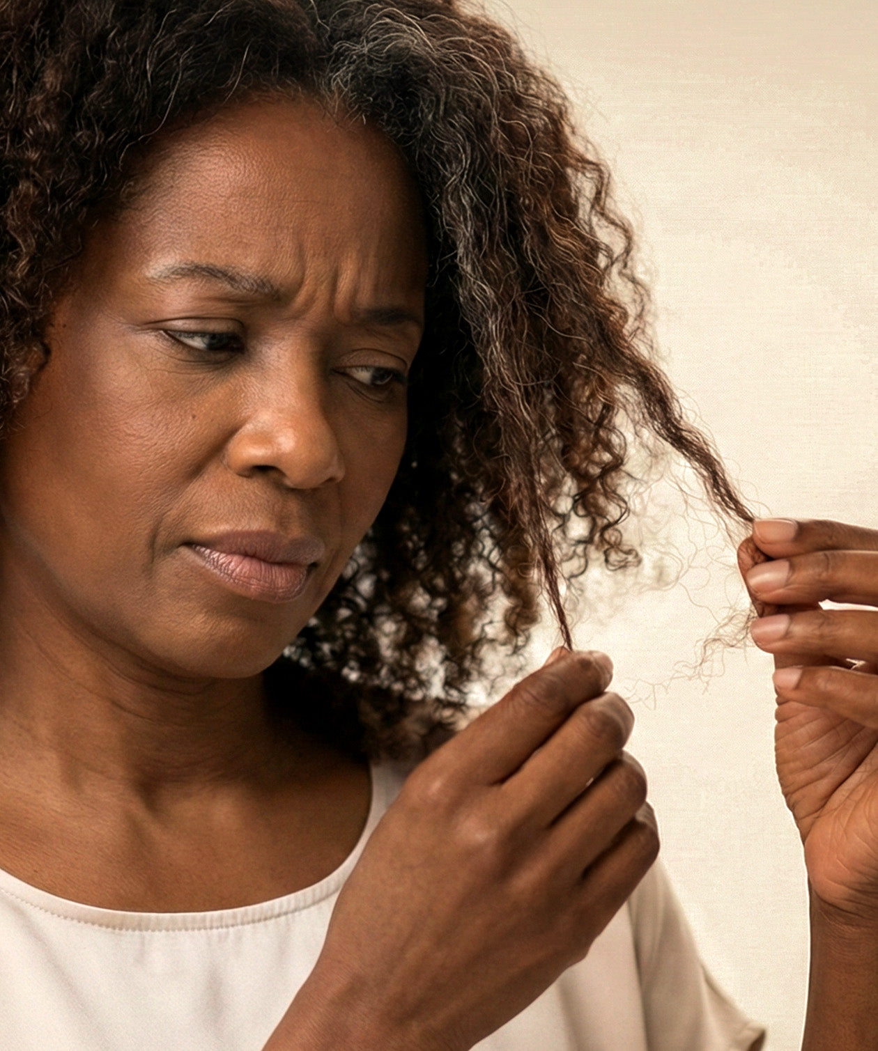 Hair during menopause often shifts in texture, becoming drier, finer, or less dense, and the scalp can respond differently to care. Gentle, consistent routines that restore scalp balance, moisture, and gradual strengthening help hair feel steadier and more manageable. With our formulations, the scalp is nurtured while the strands are supported, allowing hair to adapt gracefully and feel cared for at every step.