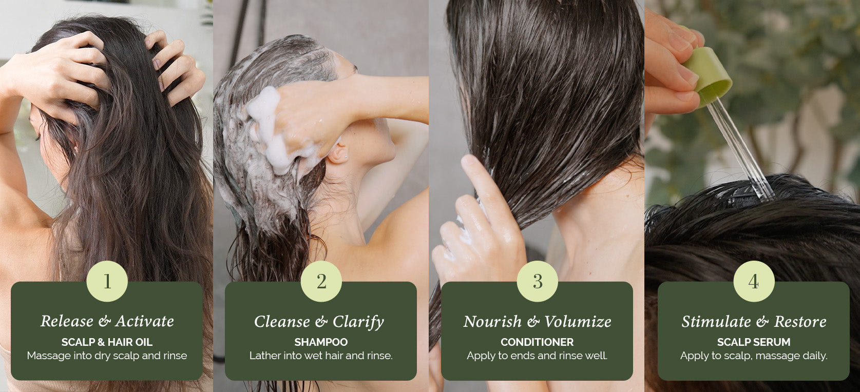 Over time, strands feel thicker, more resilient, and naturally vibrant. Featuring a nourishing oil, lightweight serum, natural shampoo for thinning hair, and a volumizing conditioner, our collection works best when used together, creating a soothing, nurturing ritual that cares for your scalp and hair while bringing a quiet moment of self-care to your day.