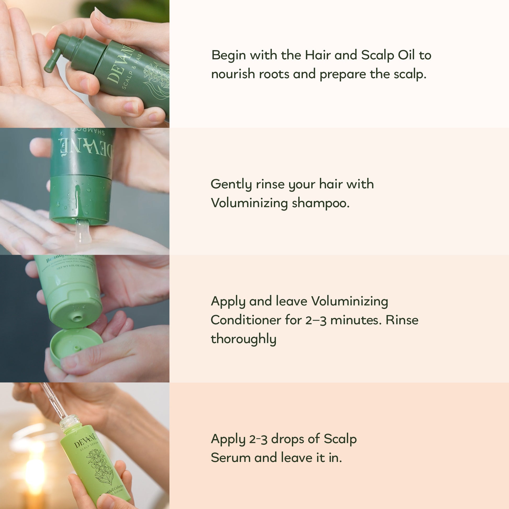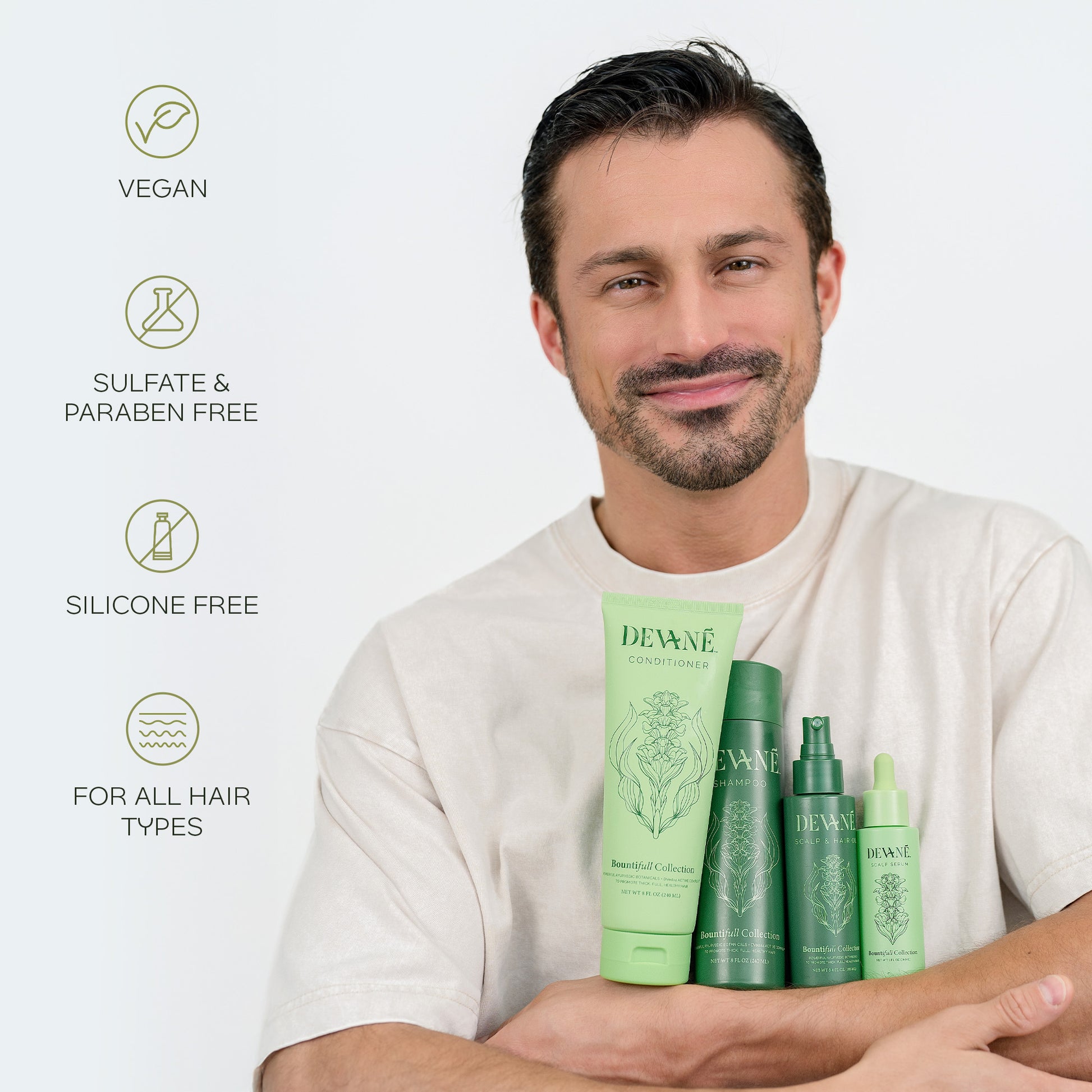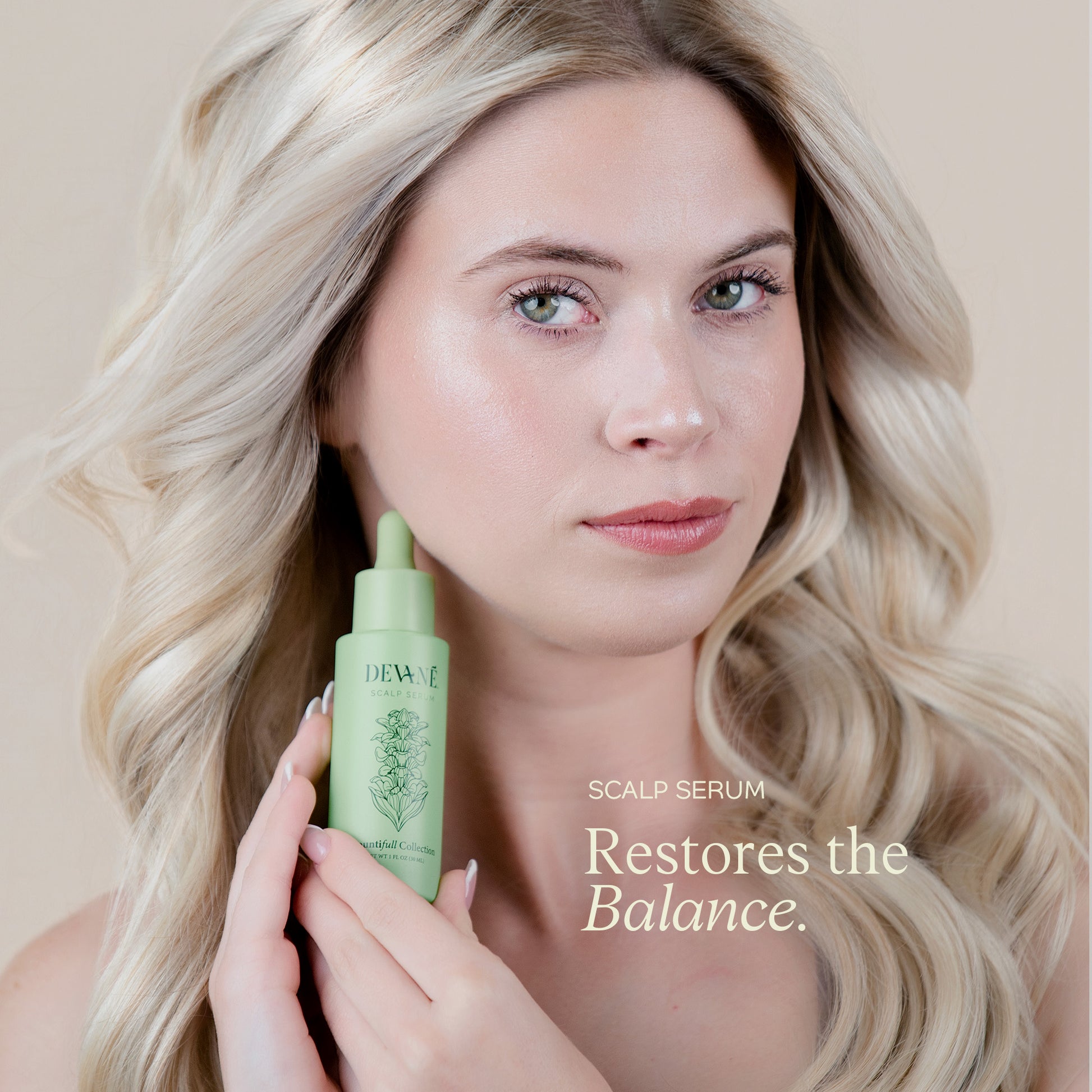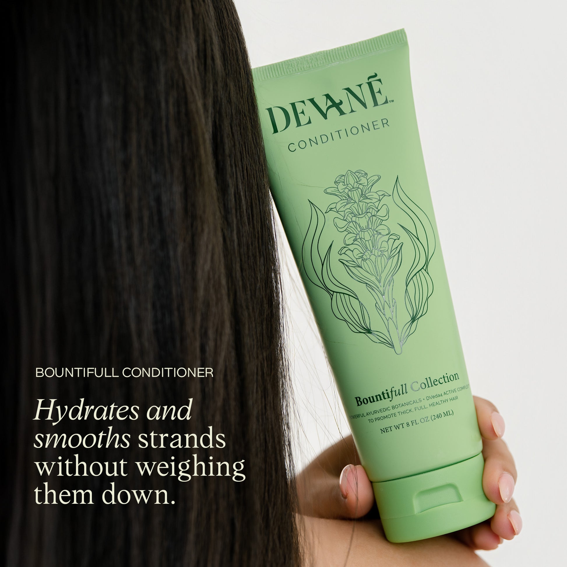 Experience the complete Devane scalp and hair ritual with our Bountifull Collection. This Ayurvedic-inspired set includes a scalp & hair oil, gentle volumizing shampoo, weightless conditioner, and a fast-absorbing scalp serum with biomimetic peptides—designed to support scalp balance, hydration, and the appearance of fuller, softer hair.
