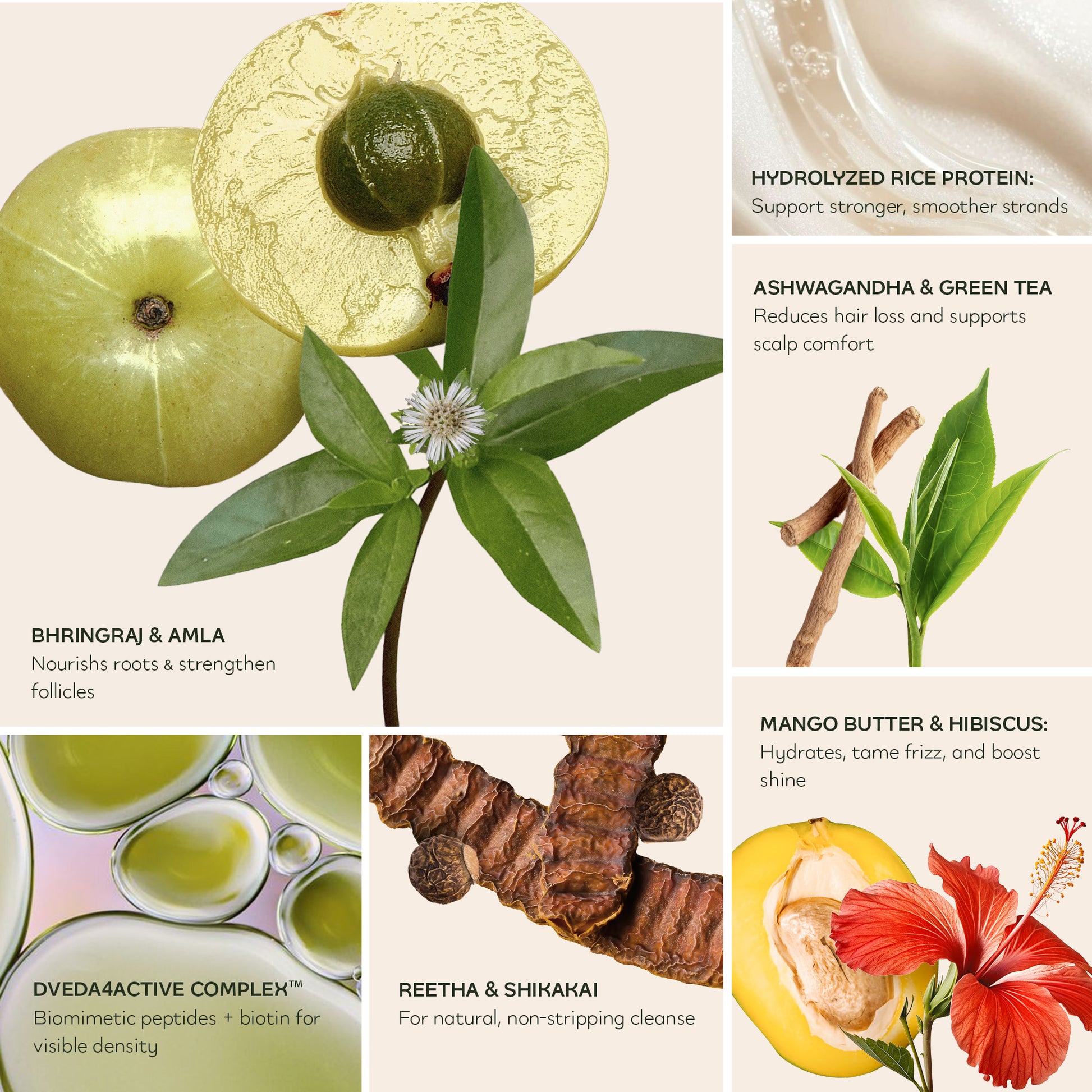 Our shampoo includes time-honored botanicals like Amla, Bhringraj, Shikakai, and Reetha—used in Ayurvedic tradition to help cleanse and support hair vitality.