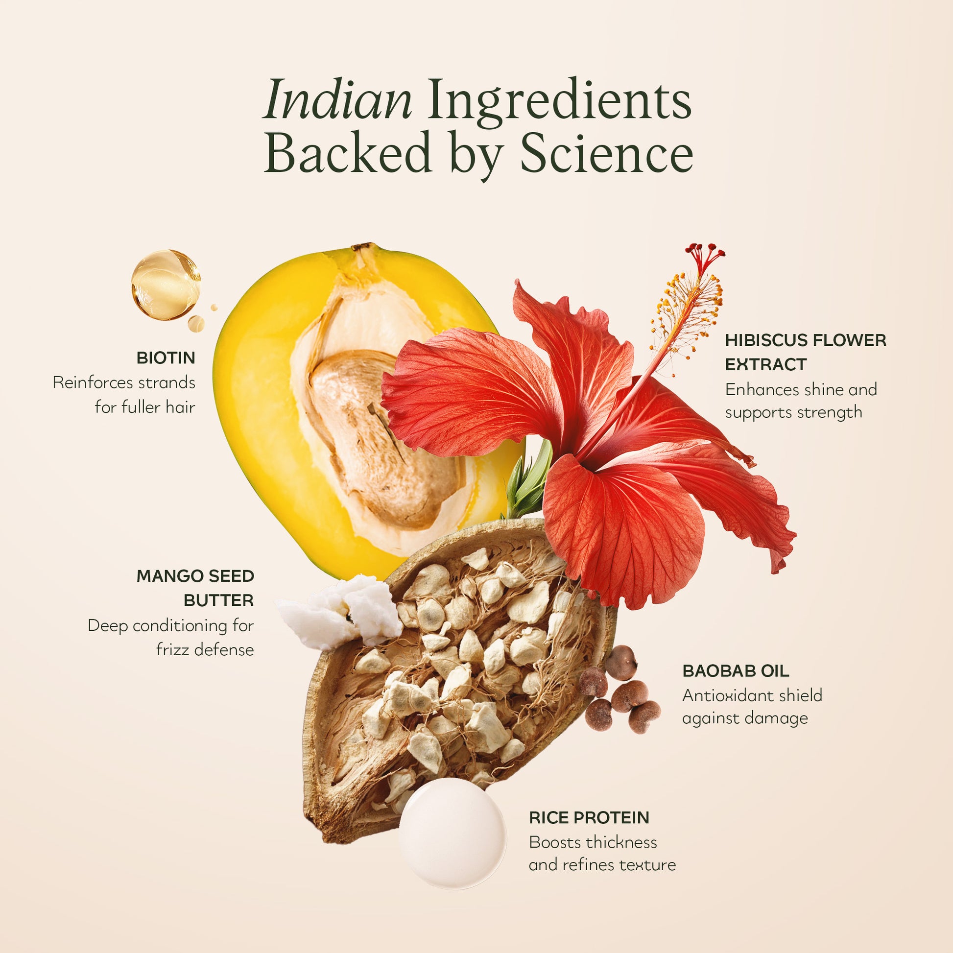 Blends Ayurvedic botanicals like Mango Seed Butter, Amla, and Fenugreek with modern actives such as Biotin and Hydrolyzed Rice Protein to support stronger-looking hair and help minimize breakage.
