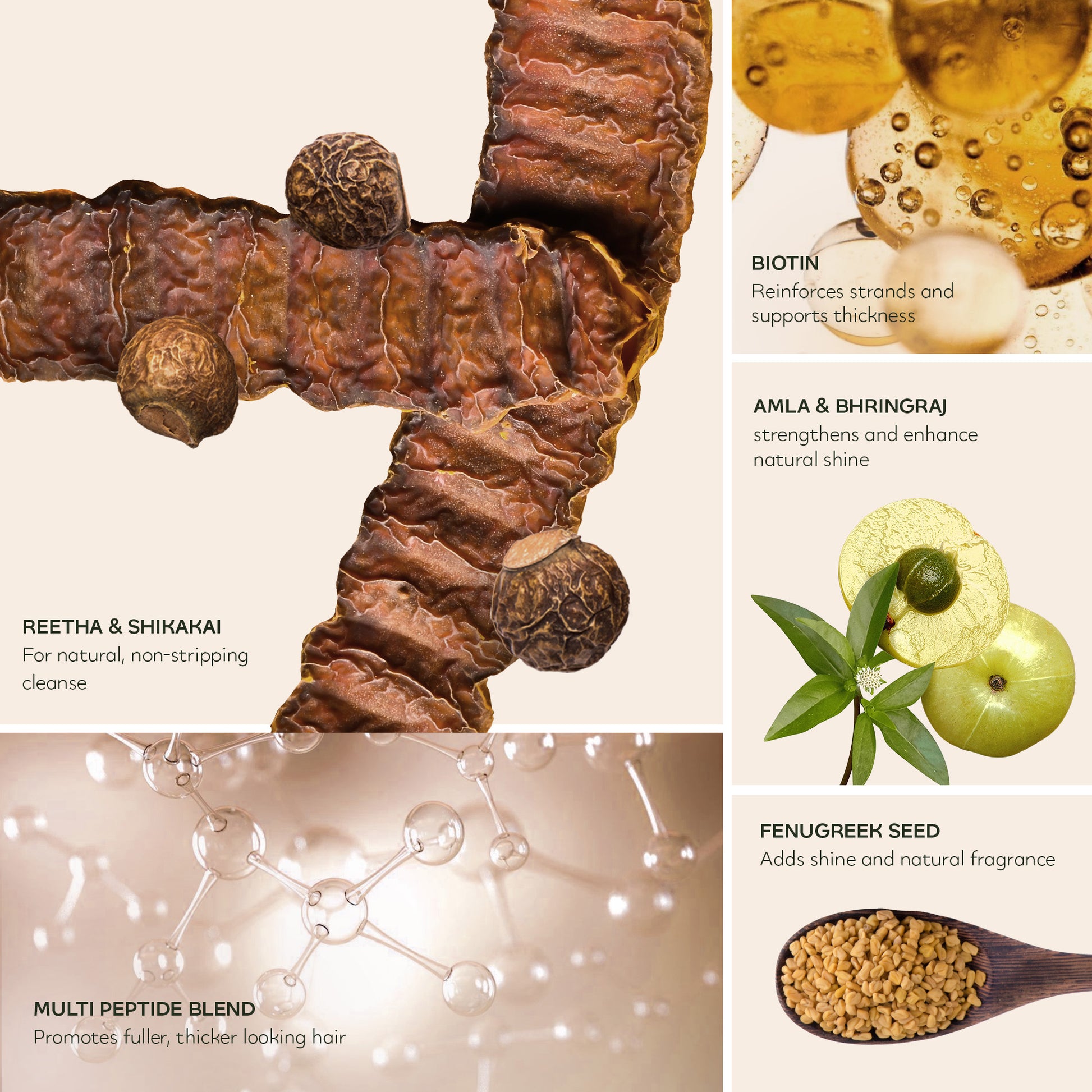 Blend of Ayurvedic herbs and peptides to promote healthy, strong, and radiant hair. - Deeply Cleanses Without Damage